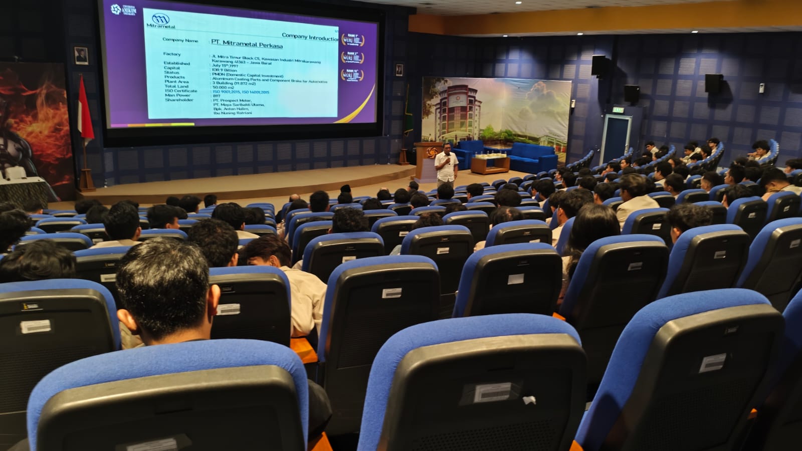 Sesi pembekalan dilanjutkan oleh Istomo Susilastoro, S.H., perwakilan dari PT Mitra Metal Perkasa (Karawang), mitra industri yang siap menampung peserta magang selama satu tahun penuh. Ia menjelaskan bahwa program ini tidak hanya memberikan pengalaman kerja nyata, tetapi juga dilengkapi dengan fasilitas lengkap, mulai dari uang saku, tempat tinggal, antar-jemput, hingga akses klinik dan BPJS Ketenagakerjaan.