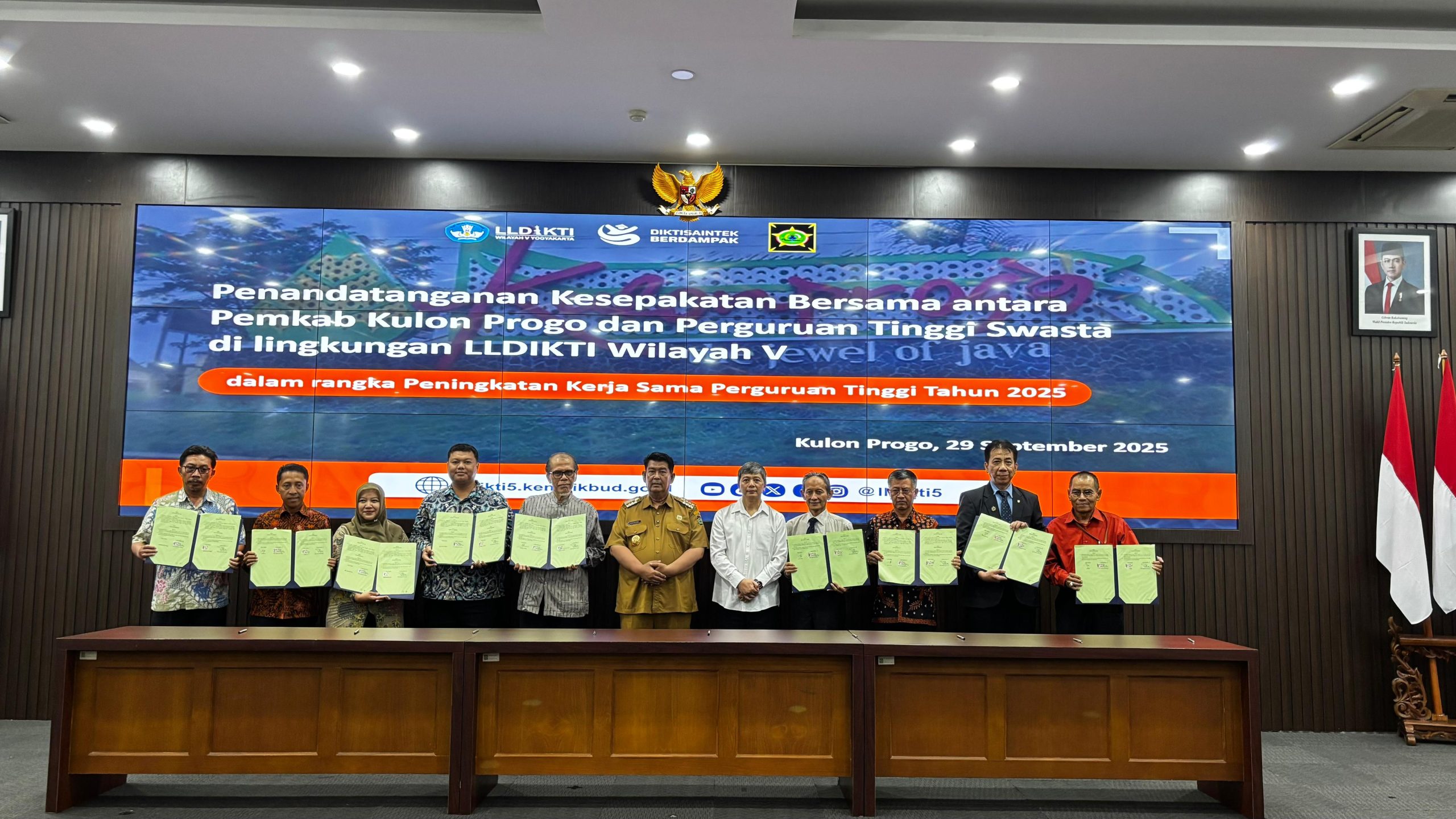 Kulon Progo, 29 September 2025 – Universitas Amikom Yogyakarta resmi menandatangani Memorandum of Understanding (MoU) dengan Pemerintah Kabupaten Kulon Progo, Daerah Istimewa Yogyakarta (DIY), dalam rangka pengembangan pendidikan, penelitian, dan pemberdayaan masyarakat. Penandatanganan dilakukan langsung oleh Rektor Universitas Amikom Yogyakarta, Prof. Dr. M. Suyanto, MM, bersama 32 perguruan tinggi swasta (PTS) lainnya di bawah naungan LLDIKTI Wilayah V Yogyakarta, bertempat di Aula Adikarta, Kantor Bupati Kulon Progo.