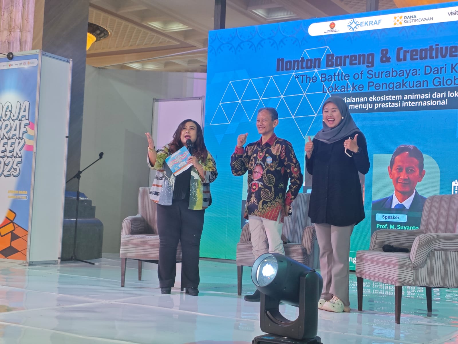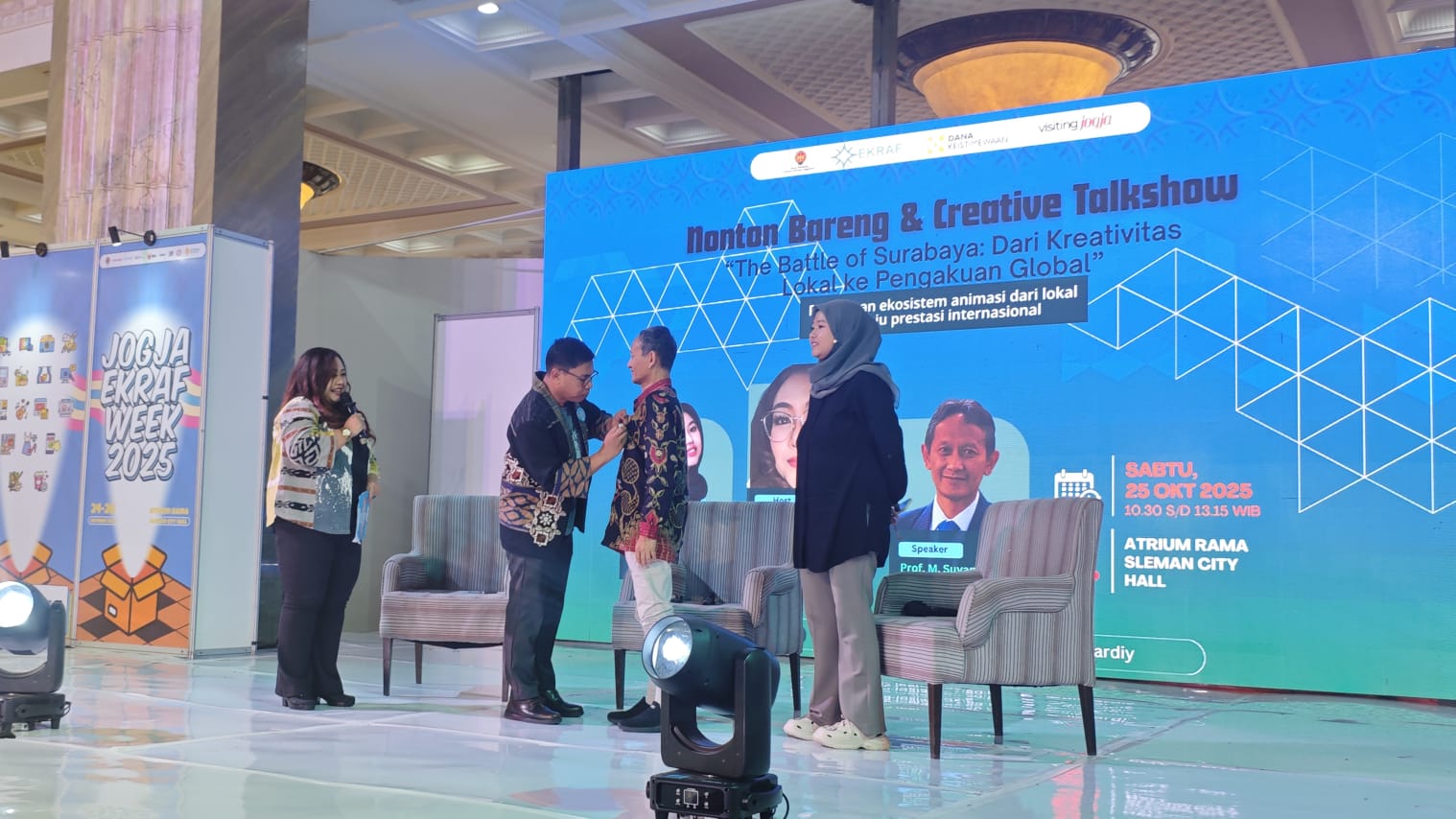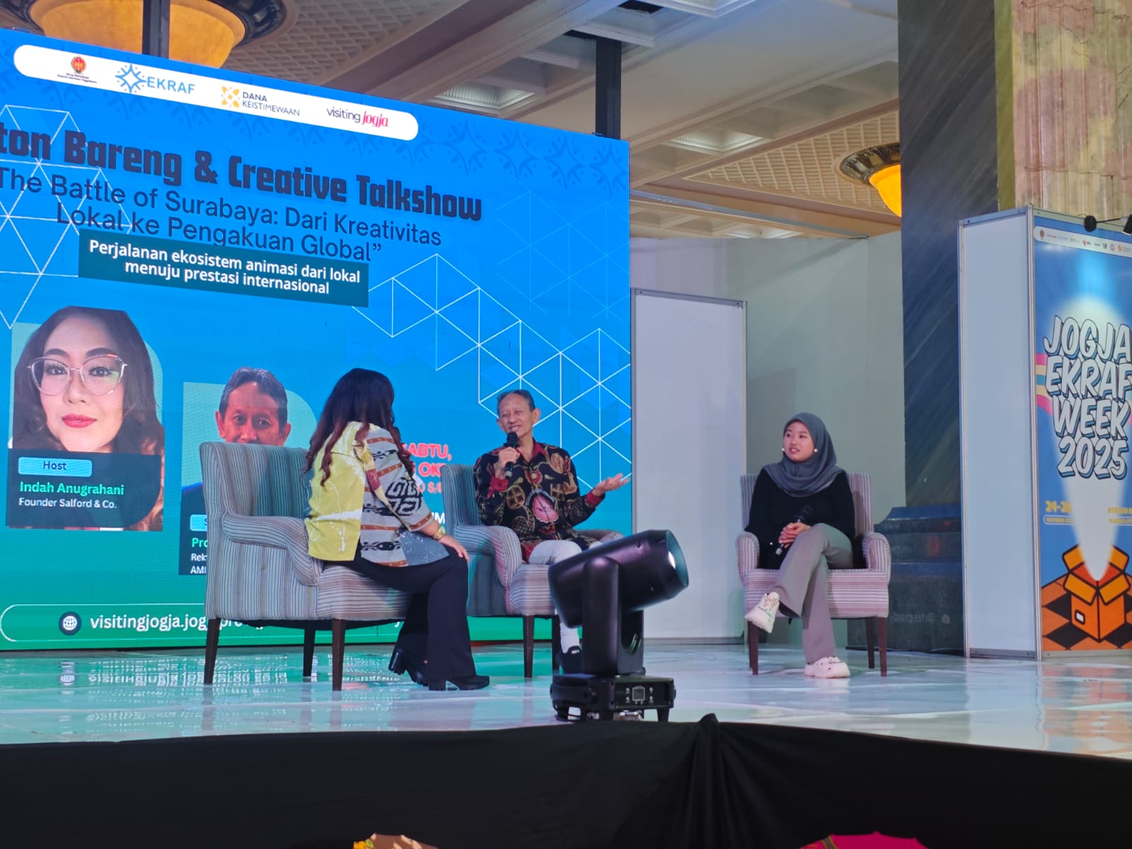 Sebelum sesi talkshow berlangsung, acara diawali dengan Nonton Bareng Film Animasi “The Battle of Surabaya” yang disambut antusias oleh para pengunjung Jogja Ekraf Week 2025. Film tersebut menjadi pembuka yang menggugah dan menguatkan konteks diskusi mengenai perjalanan karya animasi lokal menuju pengakuan global.