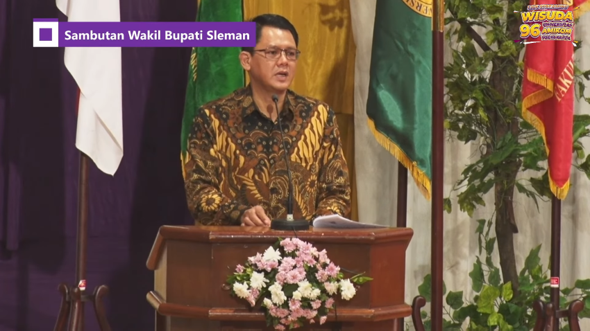 Wakil Bupati Sleman, Danang Maharsa, yang ikut hadir dalam acara tersebut. Beliau menyampaikan selamat kepada 1.133 wisudawan Universitas AMIKOM Yogyakarta yang telah resmi menyelesaikan pendidikannya. Ia mengingatkan bahwa kesuksesan ini bukanlah akhir, melainkan awal dari perjalanan panjang untuk terus belajar dan berkarya.