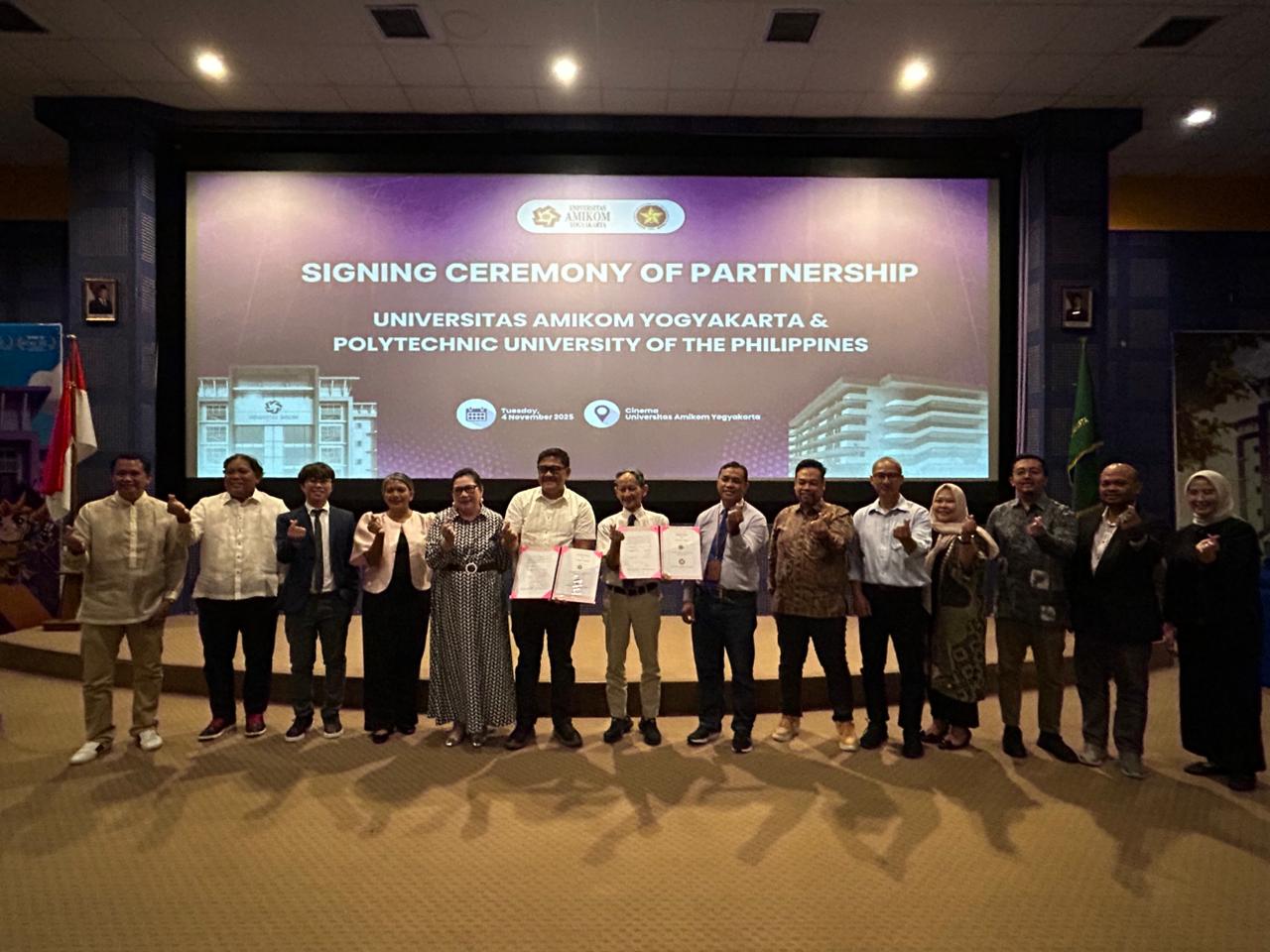 Yogyakarta, 4 November 2025 – Universitas AMIKOM Yogyakarta menandatangani Nota Kesepahaman (MoU) dengan Polytechnic University of the Philippines (PUP) dalam upaya memperkuat kolaborasi internasional di bidang pendidikan tinggi. Penandatanganan dilakukan di Gedung Cinema Universitas AMIKOM Yogyakarta oleh Prof. Dr. M. Suyanto, M.M., selaku Rektor Universitas AMIKOM Yogyakarta, dan Dr. Elmer Micu Soriano, Dean of the College of Political Science and Public Administration (CPSPA) at University of the Philippines, disaksikan oleh jajaran pimpinan dari kedua universitas.