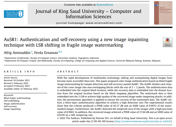 Pada Penelitian ini, Afrig mengembangkan skema fragile watermarking, yang menyisipkan data autentikasi langsung ke dalam citra. Dengan pendekatan ini, sistem mampu melokalisasi area yang dimanipulasi secara presisi dan melakukan self-recovery menggunakan teknik image inpainting.