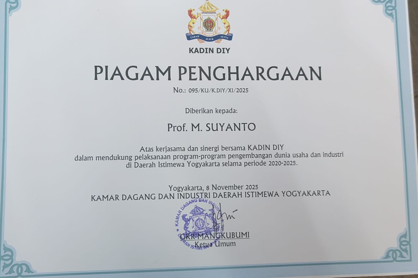 Yogyakarta, 8 November 2025 – Rektor Universitas AMIKOM Yogyakarta, Prof. Dr. M. Suyanto, M.M., menerima penghargaan dari Kamar Dagang dan Industri (KADIN) Daerah Istimewa Yogyakarta (DIY) atas kontribusinya dalam mendukung pengembangan dunia usaha dan industri di Yogyakarta selama periode 2020–2025. Penghargaan ini diserahkan dalam rangkaian Musyawarah Daerah (Musda) IX KADIN DIY yang digelar di Jogja Expo Center (JEC), Sabtu (8/11).