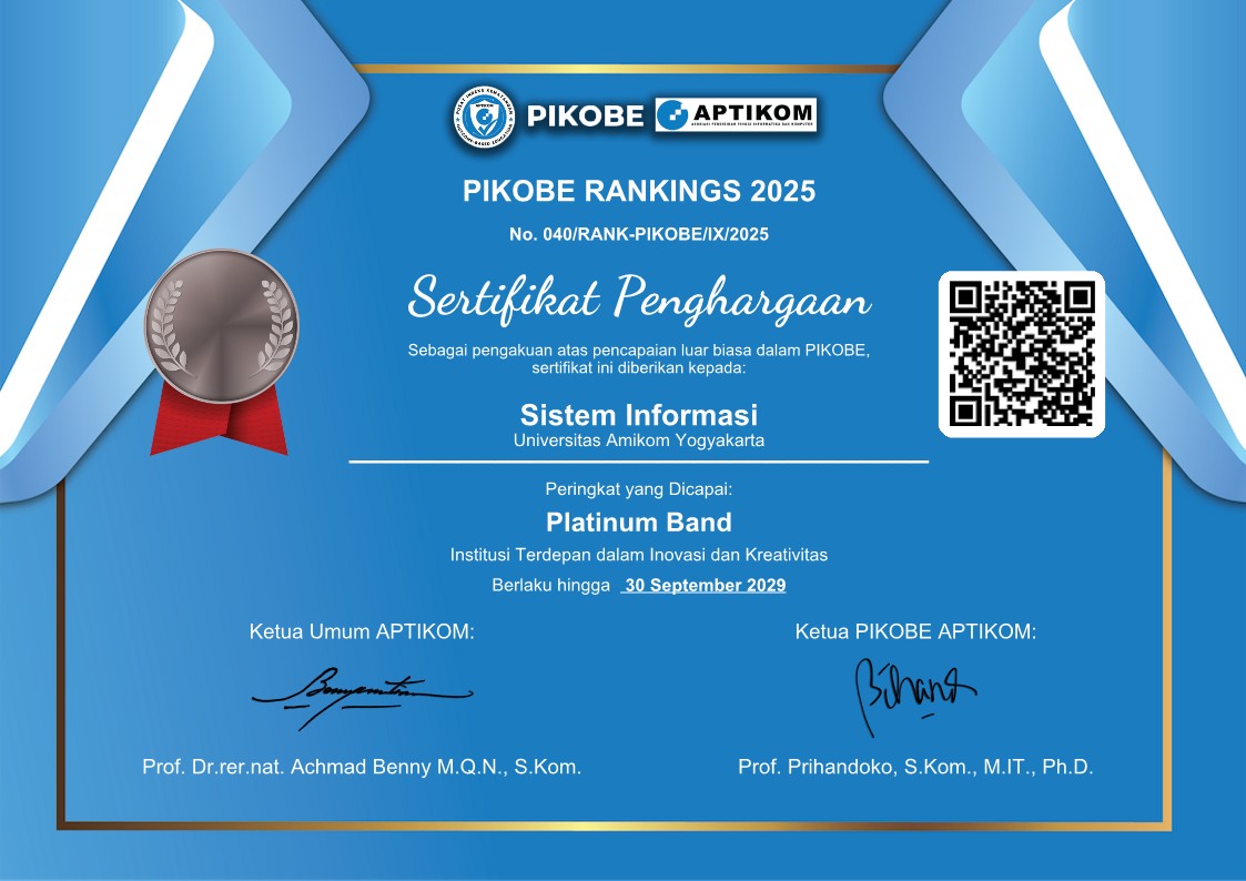 Yogyakarta, 27 Desember 2025 — Program Studi Sistem Informasi Universitas AMIKOM Yogyakarta berhasil meraih Platinum Achievement, peringkat tertinggi dalam Evaluasi Indeks Kematangan Outcome-Based Education (OBE) yang diselenggarakan oleh PIKOBE APTIKOM. Pengumuman capaian tersebut disampaikan secara resmi melalui kanal YouTube APTIKOM TV pada 27 Desember 2025, dalam rangkaian pengumuman hasil penilaian nasional PIKOBE APTIKOM Tahun 2025.