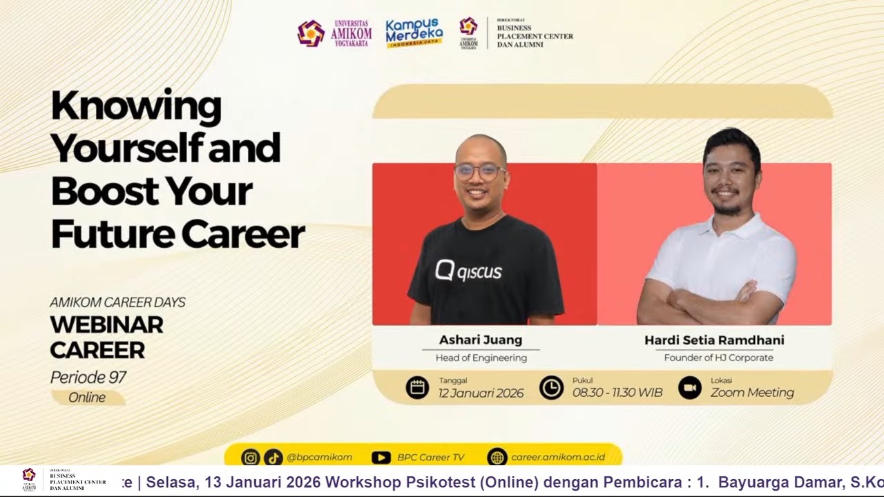 Universitas AMIKOM Yogyakarta melalui Business Placement Center (BPC) menyelenggarakan Webinar Career – AMIKOM Career Days Periode 97 secara daring melalui Zoom Meeting pada Senin, 12 Januari 2026. Kegiatan ini diikuti oleh calon wisudawan dan wisudawati Periode 97 sebagai bagian dari rangkaian AMIKOM Career Days menjelang Wisuda Januari 2026. Webinar ini bertujuan membantu peserta mengenali potensi diri serta mempersiapkan langkah karier, baik sebagai profesional maupun wirausaha, melalui pemaparan pengalaman langsung dari praktisi industri.