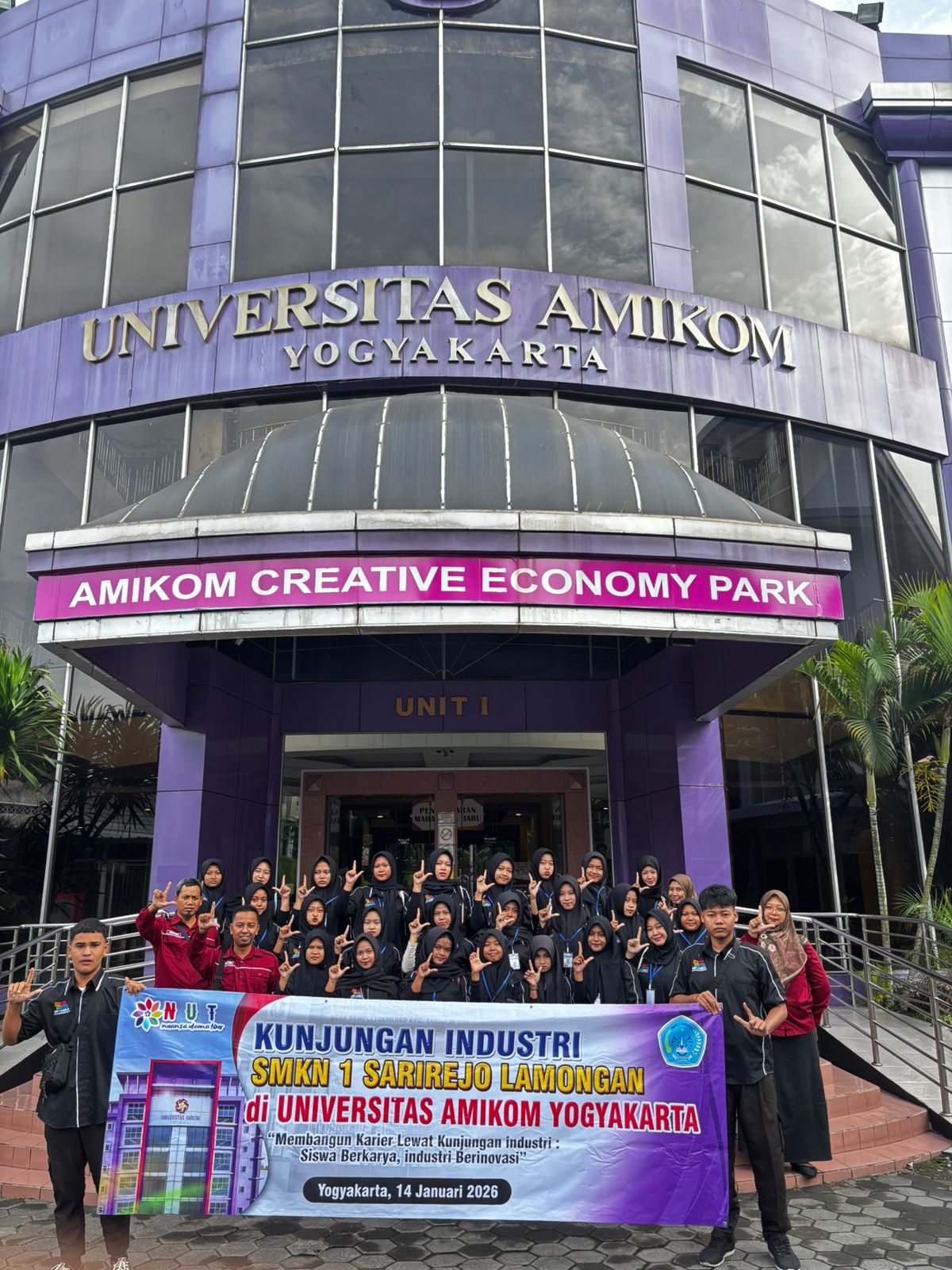 Universitas AMIKOM Yogyakarta menerima kunjungan edukatif 33 siswa dan guru dari Jurusan Desain Komunikasi Visual (DKV) SMK Negeri 1 Sarirejo, Lamongan pada Rabu, 14 Januari 2026, bertempat di Ruang Cinema Universitas AMIKOM Yogyakarta. Kunjungan ini bertujuan mengenalkan lingkungan perguruan tinggi, fasilitas pembelajaran, serta ekosistem industri kreatif kampus sebagai bekal wawasan bagi siswa dalam merencanakan studi dan karier di bidang kreatif.