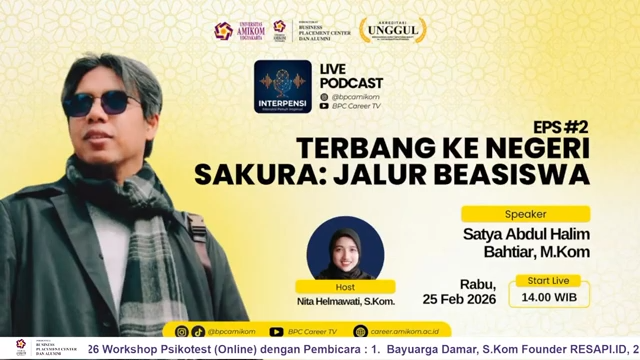 Business Placement Center dan Alumni (BPC) Universitas AMIKOM Yogyakarta menghadirkan INTERPENSI (Interaksi Penuh Inspirasi) sebagai program podcast inspiratif yang dirancang untuk menjadi ruang berbagi gagasan, refleksi, dan motivasi bagi mahasiswa, alumni, serta masyarakat luas. Dikemas dalam format obrolan santai namun berbobot, program ini menjadi salah satu inisiatif BPC untuk menghadirkan konten yang tidak hanya relevan dengan pengembangan karier, tetapi juga membuka wawasan tentang studi lanjut, peluang global, dan penguatan kapasitas diri. Dalam momentum Ramadan, INTERPENSI hadir sebagai teman ngabuburit virtual yang mengajak audiens menikmati diskusi penuh makna melalui siaran langsung di kanal digital BPC.