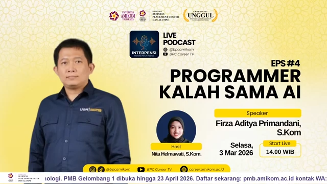 Business Placement Center dan Alumni (BPC) Universitas AMIKOM Yogyakarta kembali menghadirkan INTERPENSI (Interaksi Penuh Inspirasi) sebagai program podcast inspiratif yang dirancang untuk menjadi ruang berbagi gagasan, refleksi, dan motivasi bagi mahasiswa, alumni, serta masyarakat luas. Dikemas dalam format obrolan santai namun berbobot, program ini menjadi salah satu inisiatif BPC untuk menghadirkan konten yang tidak hanya relevan dengan pengembangan karier, tetapi juga membuka wawasan tentang perubahan dunia kerja, perkembangan teknologi, serta kesiapan talenta muda menghadapi era digital. Dalam rangkaian episode Ramadan, INTERPENSI hadir sebagai teman ngabuburit virtual yang mengajak audiens menikmati diskusi penuh makna melalui siaran langsung di kanal digital BPC.