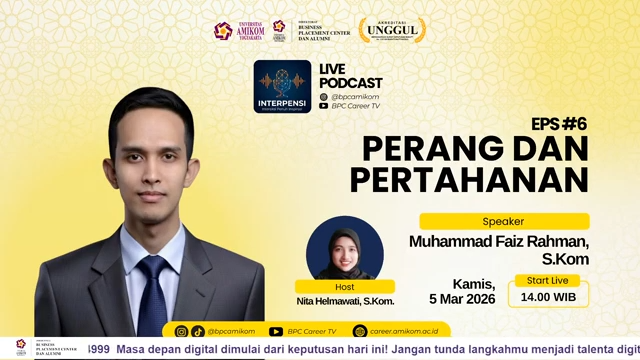 Business Placement Center dan Alumni (BPC) Universitas AMIKOM Yogyakarta kembali menghadirkan INTERPENSI (Interaksi Penuh Inspirasi) sebagai program podcast inspiratif yang dirancang untuk menjadi ruang berbagi gagasan, refleksi, dan motivasi bagi mahasiswa, alumni, serta masyarakat luas. Dikemas dalam format obrolan santai namun berbobot, program ini menjadi salah satu inisiatif BPC untuk menghadirkan konten yang tidak hanya relevan dengan pengembangan karier, tetapi juga membuka wawasan lintas bidang, termasuk isu-isu strategis yang berkaitan dengan teknologi, keamanan, dan dinamika global. Dalam rangkaian episode Ramadan, INTERPENSI hadir sebagai teman ngabuburit virtual yang mengajak audiens menikmati diskusi penuh makna melalui siaran langsung di kanal digital BPC.