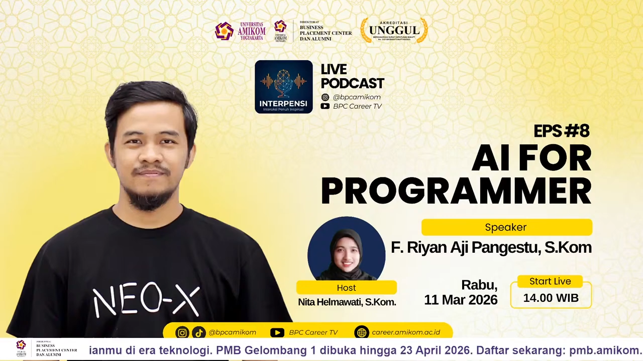 Pada episode kedelapan, INTERPENSI menghadirkan F. Riyan Aji Pangestu, S.Kom, alumni Universitas AMIKOM Yogyakarta yang membahas tema “AI for Programmer.” Riyan memiliki latar belakang yang menarik karena pada awalnya ia tidak langsung fokus pada dunia pemrograman. Saat masih di SMK, ia lebih banyak mendalami bidang jaringan. Namun ketika menempuh perkuliahan di Universitas AMIKOM Yogyakarta, ia akhirnya masuk ke konsentrasi pemrograman dan justru menemukan ketertarikan yang kuat di bidang tersebut. Dari pengalaman itulah, Riyan memahami bahwa coding bukan hanya soal menulis perintah, tetapi juga soal logika, alur berpikir, dan kemampuan menerjemahkan ide menjadi sistem yang bisa berjalan dengan baik.